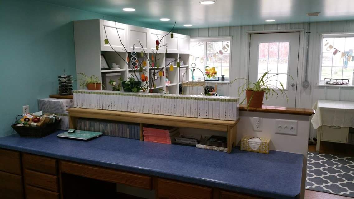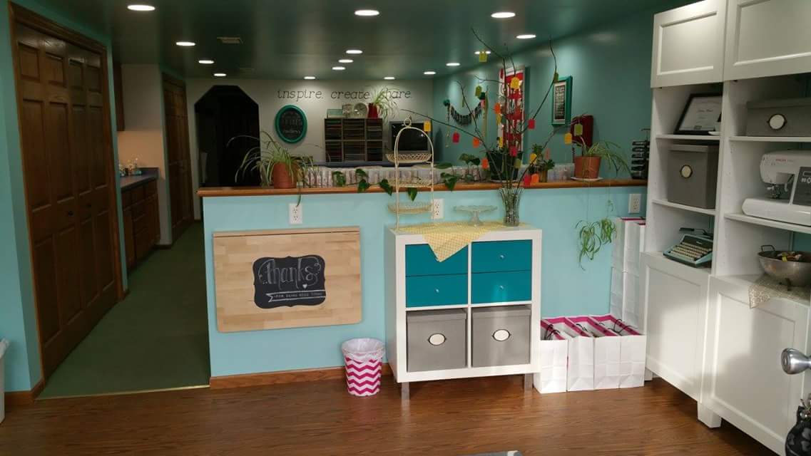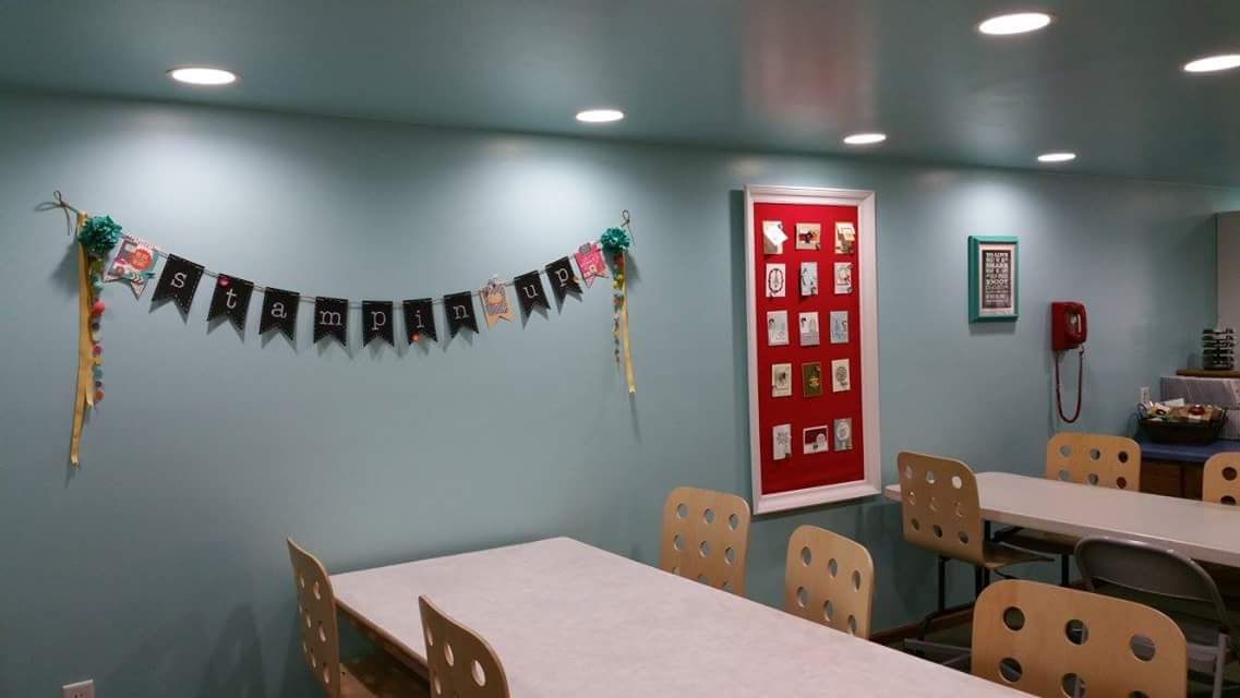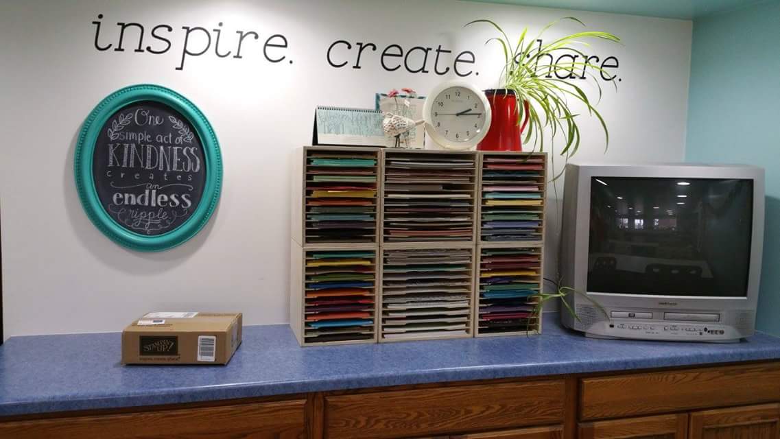 In our stamping area there are two 8 foot tables, and 4 people per table is ideal.  For team days and special events we might squeeze in a few more.  The big frame on the wall displays swap cards, and it’s made with sheet metal covered by a bed sheet inside of an old frame I painted white.  Magnets hold the cards in place and I switch out the cards monthly.  The colorful banner is Stampin Up’s chalkboard banner (now retired).  It’s portable and I sometimes use it at craft fairs.  Stampin Up now carries canvas banners that would work great for this purpose, hooray!  The smaller frame holds Stampin Up’s “statement of the heart” which states “To love what we do and share what we love, as we help others enjoy creativity and worthwhile accomplishments…in this we make a difference.”  So true!  As a Stampin Up demonstrator I love to share, and it’s exciting to see a new stamper admire a card they just created and hear the words “I can’t believe I just made this!”  Receiving a handmade card in the mail can really make someone’s day; it reminds me of one of my favorite quotes…One simple act of kindness creates an endless ripple.