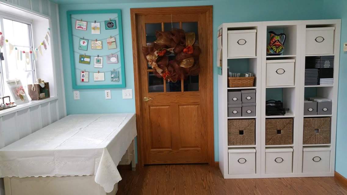 Here’s what you see when you first come in and look to the left.  Behind that wooden door is where I park my vehicle, and chances are there is a tractor in there too.  I shopped at IKEA for the storage unit, it’s very sturdy and holds all of my Big Shot supplies, along with other goodies in the storage boxes.  One of my favorite things on the shelf is the beautiful pitcher I received as a gift from Stampin Up while on a Getaway Trip to San Diego. The card display frame on the left was originally black but I painted it Bermuda Bay to match the Pool Party room. (please tell me I’m not the only one who relates every color I see to the Stampin Up color palette!)  On the back of the frame, I stapled some twine and added clothespins to show off some of my all time favorite swaps.