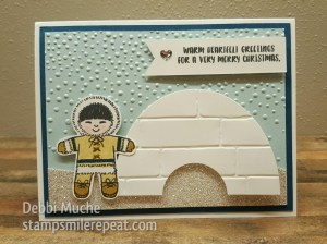 We used 2 different embossing folders to get this look. Softly Falling folder was used on the background for snow, and the Brick folder was used to create an igloo. An oval framelit and a circle punch make the job extra easy. To color the face just the right shade of pink, we used a sponge dauber, dipped it into pink pirouette stamp pad and pressed it onto her face with a twist. The dauber is just the right size, and creates an even shade that’s just the right color. Then we used the matching marker to draw on little rosy cheeks. What a cutie! Last, we added a bit of Wink of Stella to the edges of her fur coat.