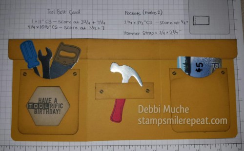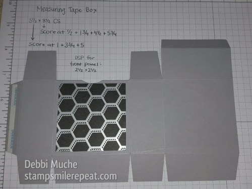 Our last card was this fun Waterfall card, made with the Cookie Cutter Halloween stamp set from Stampin Up. We haven’t done one of these in class for a while and it worked great because we could use all of the Halloween characters on one card! Anyone who has been to my classes knows how frugal I am with my paper, I am always trying to get the most out of a sheet of card stock or DSP, so let me tell you the measurements for this card in case you want to try it for yourself. The base is 4.25 x 5.5″, and the brick designer series paper is from the Halloween Night designer series paper package and it measures 3″ tall and 4″ wide. This measurement allows you to get enough for 12 backgrounds from just one sheet of 12×12 paper, that helps a lot when making multiples of any card! The strip of elegant eggplant is 4.25 x 1″, and we stapled it just on the edges so it just matches up to the edge of the brick, no overlapping. Next is the mechanism to make the waterfall effect work, that piece measures 2.75 x 8″ and we scored it at 1.25 + 2 + 2.75 + 3.5. Then add tear tape along the shortest edge nearest to the score lines, as shown.